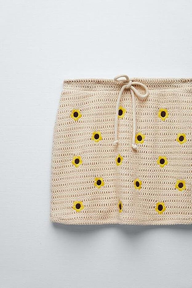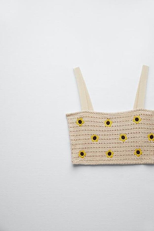 En esta ocasión, hemos elegido un conjunto que podrás llevar a juego o combinarlo directamente por separado con otro tipo de prendas. Para la parte de arriba, los diseñadores de la firma de Inditex han creado un top corto de escote recto y tirantes anchos con detalles de flores bordadas en color amarillo en contraste con el tono beige del crochet que va a iluminar tu bronceado en la playa. Ideal para llevarlo sobre el bikini, ninguna prenda denim se resistirá a esta pequeña joyita: vaqueros, bermudas, faldas mini, petos... Cuesta 15,95 euros y está disponible en las tallas S, M y L.