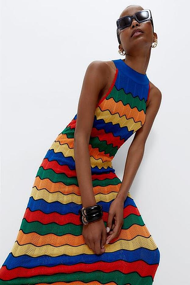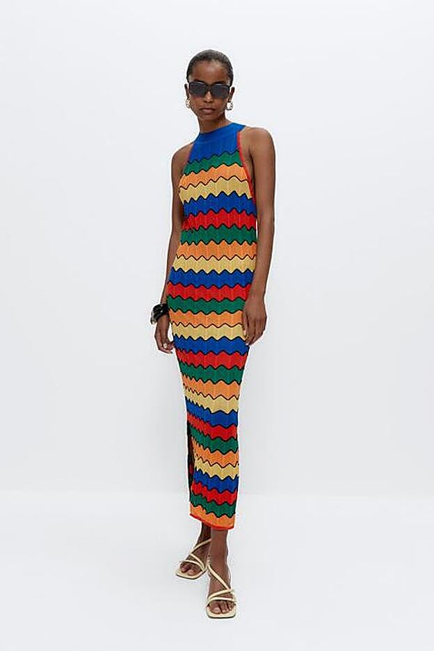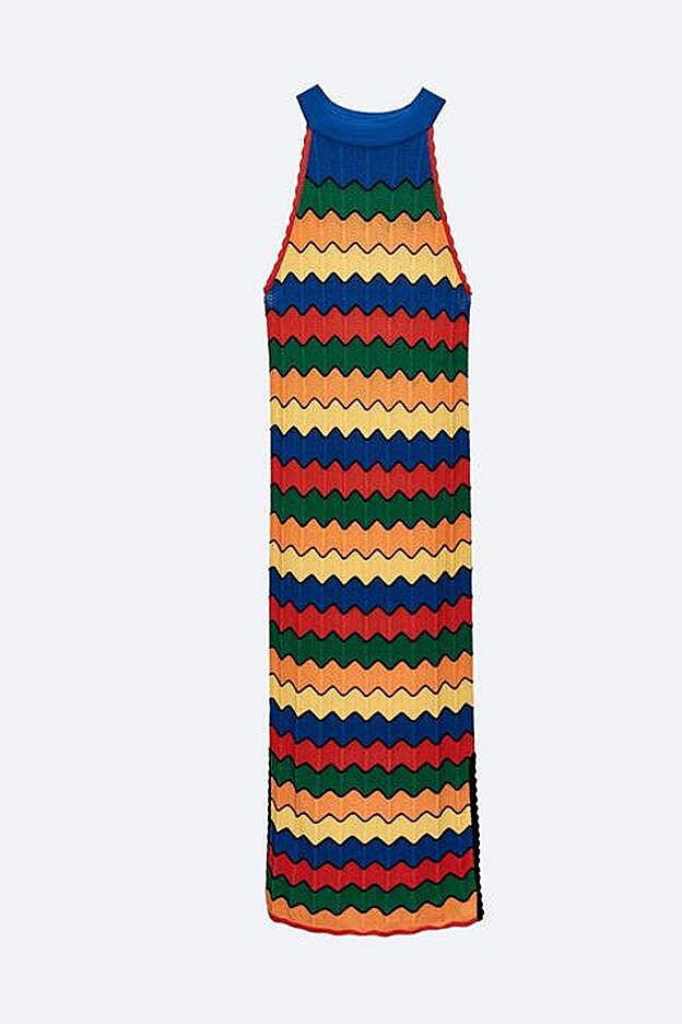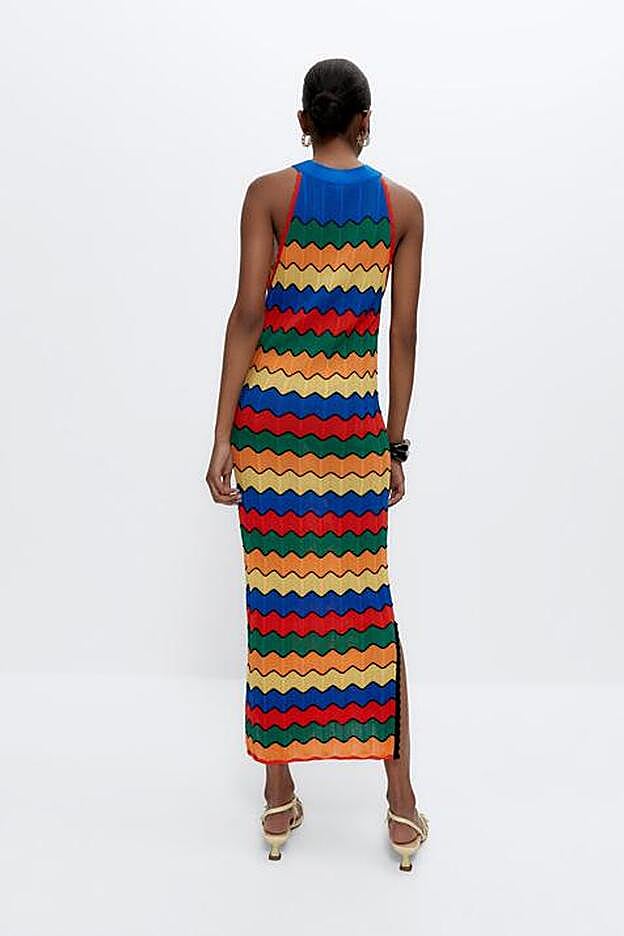 Confeccionado en punto calado y con un patrón recto, este vestido tiene un llamativo estampado multicolor en franjas irregulares horizontales. Una grecas muy favorecedoras que nos recuerdan a la estética setentera.