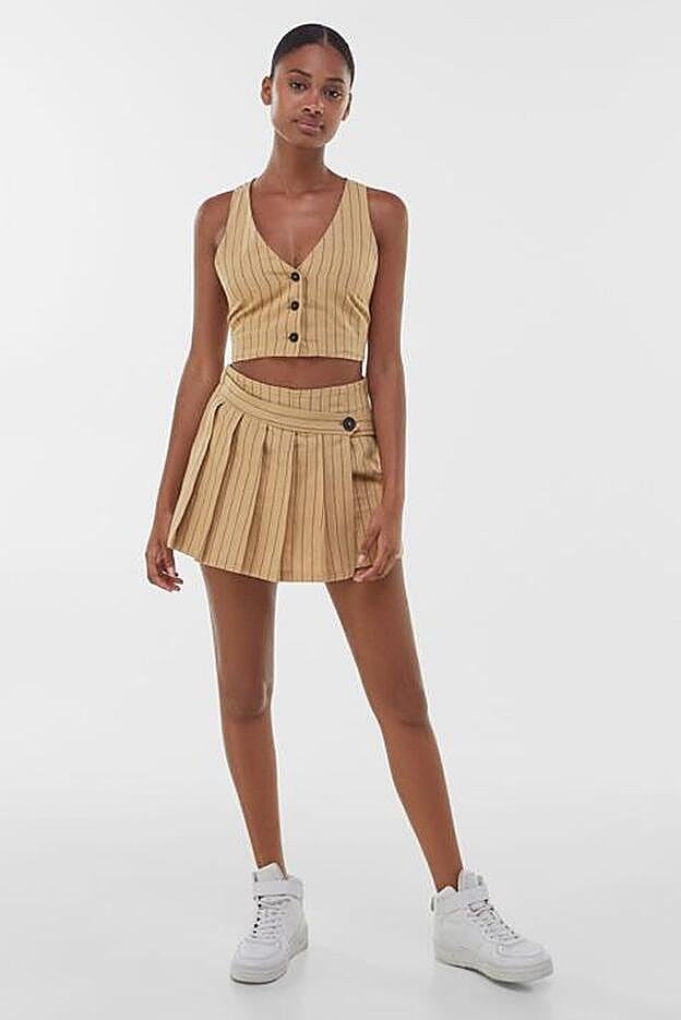 En el segundo conjunto, de color camel con rayas negras, el top es de diseño cropped tipo chaleco y tiene cierre frontal de tres botones a contraste. Con espalda cruzada y detalle cut out, cuesta 15,99 euros y está disponible entre las tallas XS y L.