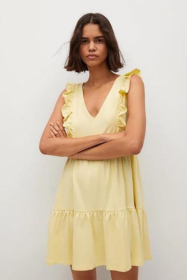 Si buscas algo mucho más low cost, toma nota de la propuesta de Mango. Es un vestido mini disponible en varios colores, aunque este amarillo nos ha gustado más que ninguno, y tiene el escote en pico y un volante en el ancho en el bajo. Cuesta 15,99 euros.