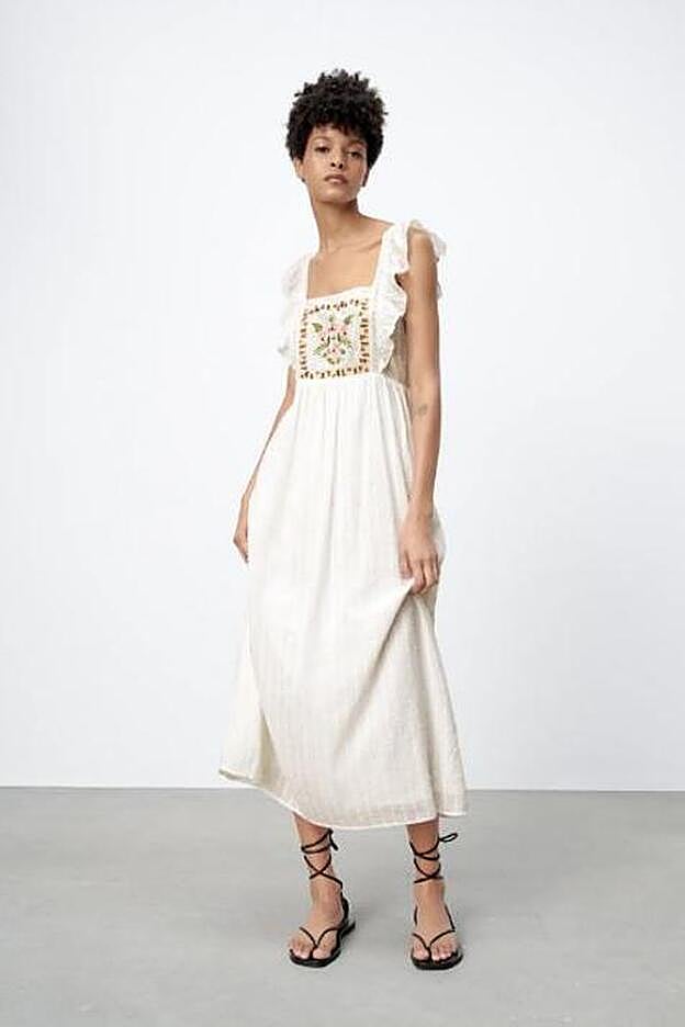Zara también ha apostado por esta tendencia en un vestido de largo midi que está caracterizado por el escote recto y un cuerpo adornado con unos bonitos bordados. Cuesta 39,95 euros.
