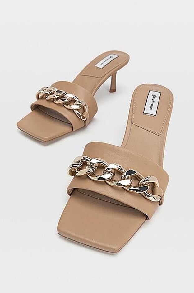 Si te gustan con tacón, en este caso puedes encontrarlas en color marrón, con una cadena algo más fina pero también en el empeine. Cuestan 29,99 euros y si te gustan tendrás que buscarlas en las tiendas porque en la web se han agotado.