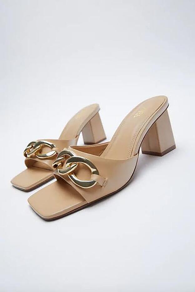En Zara también tienen dos versiones y la que tiene tacón medio ancho es de color beige y está confeccionada en piel curtida de manera sostenible. Con detalle de cadena gruesa en el empeine y punta cuadrada, cuestan 39,95 euros y están disponibles entre los números 36 y 41.