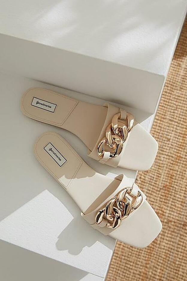 En Stradivarius las han lanzado en dos versiones, para que no puedas resistirte a ellas. En diseño plano, vienen con la cadena en dorado sobre la tira ancha del empeine. Y están disponibles en negro o en crudo. Con un precio de 25,99 euros, podemos encontrarlas entre los números 35 y 41.