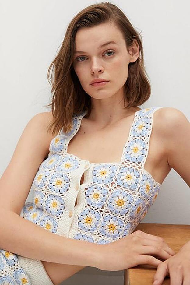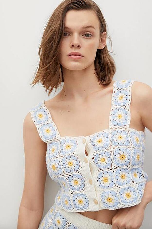 Con cierre de botones en efecto madera frontal, este bonito top crochet de Mango tiene un precio de 39,99 euros y en la web solo queda ya en la talla XS-S.