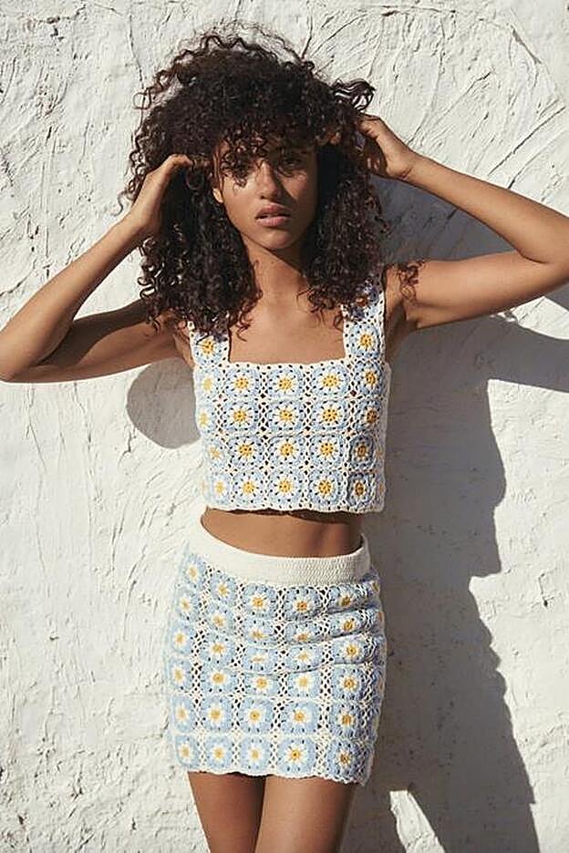 La minifalda a juego es de tiro alto y viene con detalles calados en el tejido crochet con algodón y en punto.