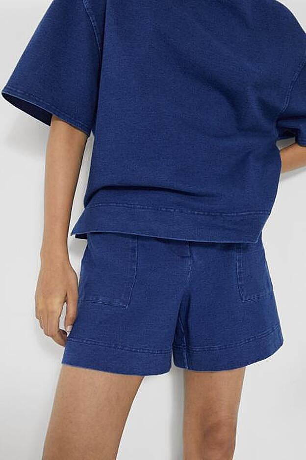 El pantalón corto, o shorts, a juego viene con cierre mediante cremallera oculta por tapeta y dos botones, dos bolsillos laterales y trabillas para el cinturón. Confeccionado en algodón, tiene un precio de 39,95 euros y está disponible entre las tallas XS y L.