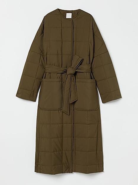 En cambio, si prefieres algún color más ponible y menos atrevido, la firma sueca también tiene una posibilidad original para ti. Es un abrigo guateado y ligeramente acolchado en color verde caqui que tiene un diseño largo y de manga larga con hombros marcadamente caídos, con cierre oculto con botones de presión y cinturón de anudar de quita y pon.