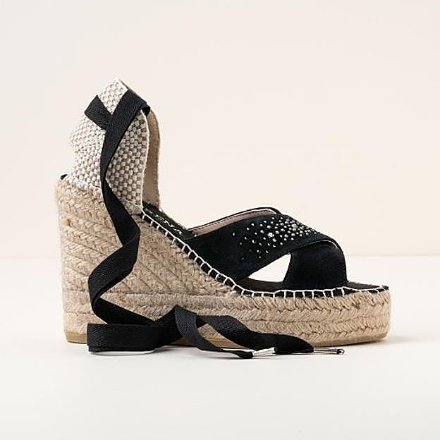 Sofisticadas y atemporales. Las alpargatas de cuña de Macarena son características por su favorecedor diseño de palas cruzadas con cristales que hacen que sean perfectas para los looks de noche. Además, sus plantillas acolchadas de 5 mm, proporcionan la máxima comodidad. Precio: rebajadas a 76,50 euros.