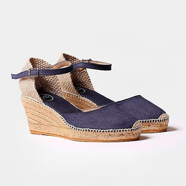 Esta alpargata de cuña con cierre de hebilla es de Toni Pons y está elaborada en tonos lisos. Tiene una altura total de 7 cm, de los cuales 5 cm pertenecen al tacón y 2 cm a la plataforma. Toda la cuña está hecha de yute y la suela interior está forrada en tejido. La unión del tejido y la suela está cosida a mano con un hilo de algodón y tiene un refuerzo en la punta. La base de la suela es de goma antideslizante y es un modelo 100% vegano. Precio: 65 euros.