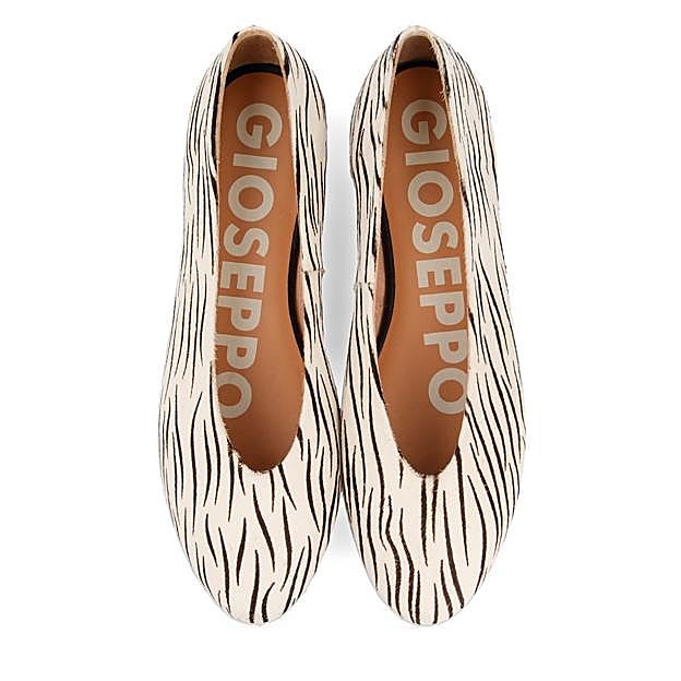 Gioseppo. Bailarinas de piel con print de cebra y tacón metálico de 1,5cm. Tienen una suela muy flexible y plantilla acolchada de látex que garantiza el mayor confort.