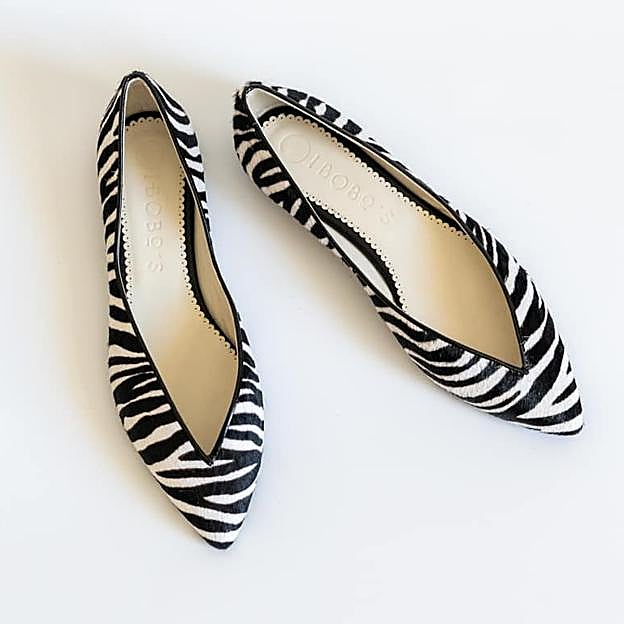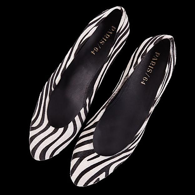 Paris/64. Bailarina de pelo de potro muy suave de estampado de cebra fabricada artesanalmente en España. El escote estiliza muchísimo y tiene un taconcito muy especial que marca la diferencia. Precio: 155 euros.