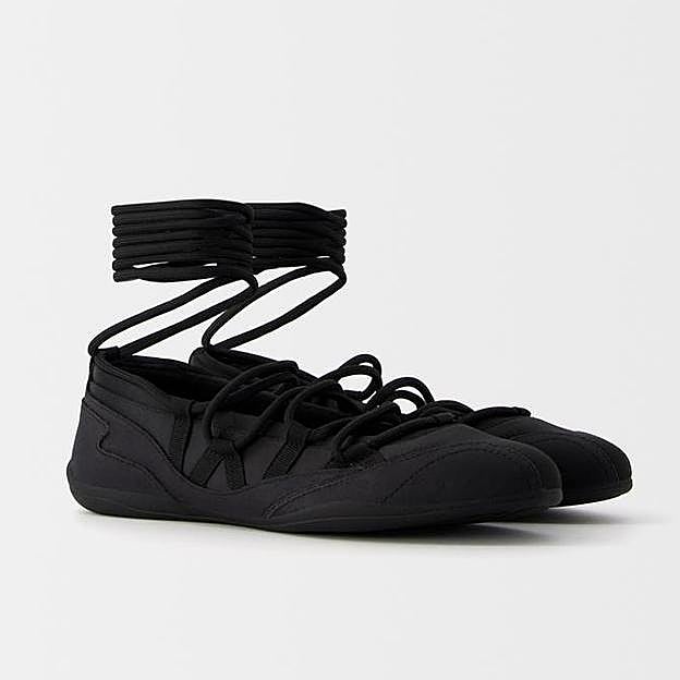 Bailarina deportiva atada de Bershka. Destca por tener una plantilla técnica flexible de espuma compuesta de látex, diseñada para ofrecer un mayor confort. Cuesta 29,99 euros y está disponible también en color rosa.