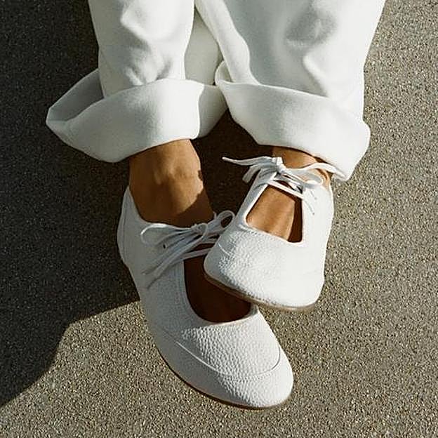 Estos zapatos planos tipo bailarina son ideales de Zara. Tienen el detalle de abertura en la parte delantera y un cierre mediante cordones. Son de color blanco y cuestan 25,95 euros.