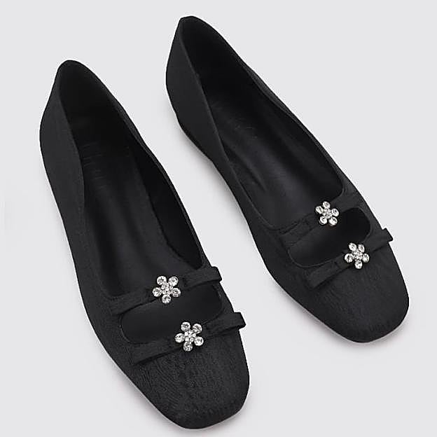 Es el caso de las bailarinas negras de Hune, una marca con hormas inusuales, patrones llamativos, diseños sorprendentes, colores y texturas nuevas que puedes encontrar a la venta en Crack. Y un buen ejemplo es este zapato con doble tira y una flor brillante en cada una de ellas (49,95 euros).