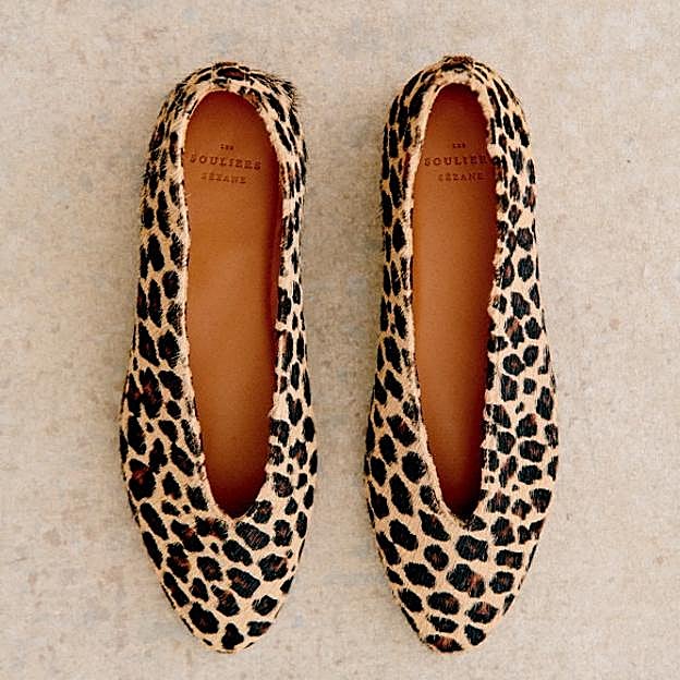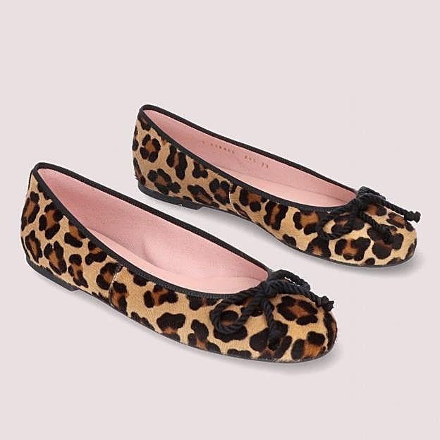 Bailarina de corte bajo cofenccionada en una piel de efecto pelo con animal print y un lazo negro. Tiene la suela de goma, la plantilla de piel y el forro de tela. Son de Pretty Ballerinas y cuestan 199 euros.