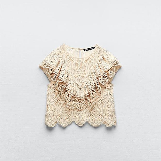 A las amantes del vintage les encantará este top de tejido de encaje en color rosa claro. Tiene cuello redondo, maga corta y se embellece con detalle de aplicación de volantes en el cuerpo y mangas, terminando en un bajo festoneado. ¿Su precio? El mismo que el anterior, 25,95 euros y está disponible de la talla XS a la XL.