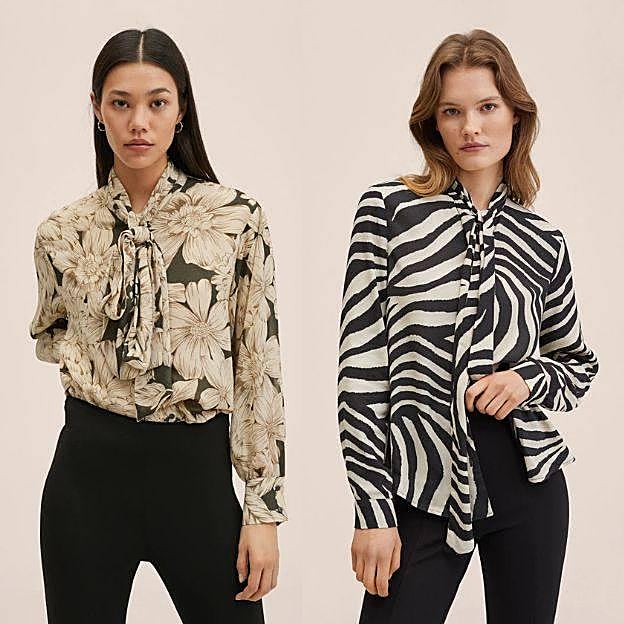 Si deseas alegrar y reavivar tu estilismo, están las opciones estampadas de Mango. En primer lugar, una blusa de tejido ligero, cuello redondo con tiras para lazo y cierre de botones, en motivos florales color verde y crudo, a 29,99 euros. El segundo diseño, una camisa oversize fluida con cuello escotado y detalle de lazada, decorada con animal print de cebra en blanco y negro. Disponible al mismo coste que la anterior.