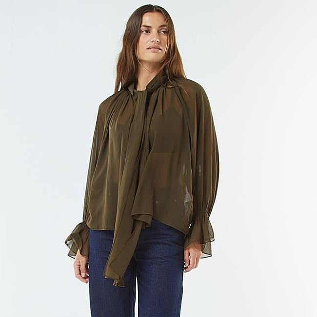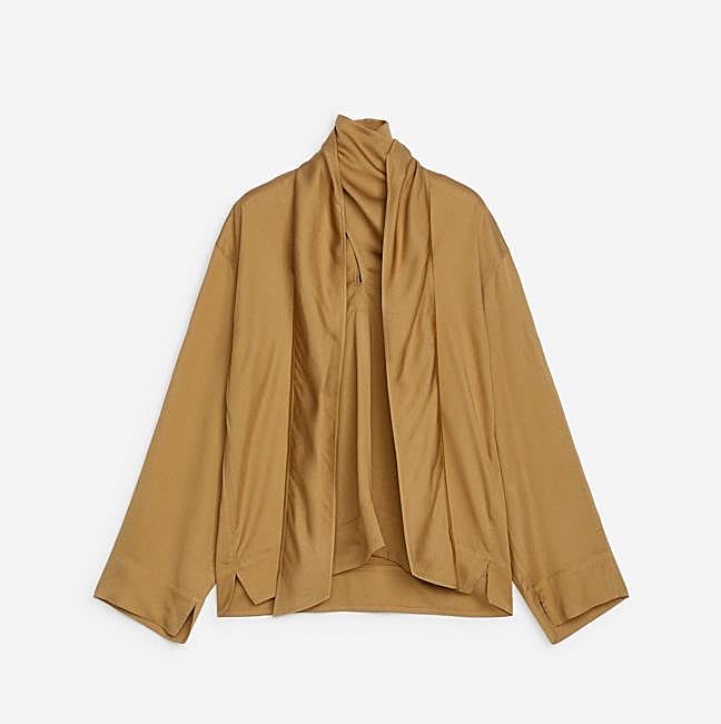 Blusa de manga larga de Arket con cuello bufanda, aberturas laterales y en los puños. Tiene un corte regular y un color ocre de lo más otoñal. Precio: rebajada a 53,40 euros.