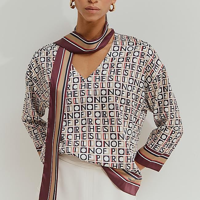 Elegante blusa fluida con un colorido estampado de Lion of Porches en toda la pieza, perfecta para añadir un toque de personalidad a tu look. Tiene manga larga, escote en pico y cinta para atar al cuello. Precio: 89,99 euros.