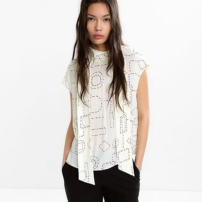 Blusa estampada con pañuelo de Parfois. Tiene el cuello alto, manga corta y un cierre de botón en la parte posterior. Destaca por el detalle de abalorios. Precio: rebajada a 9,99 euros.