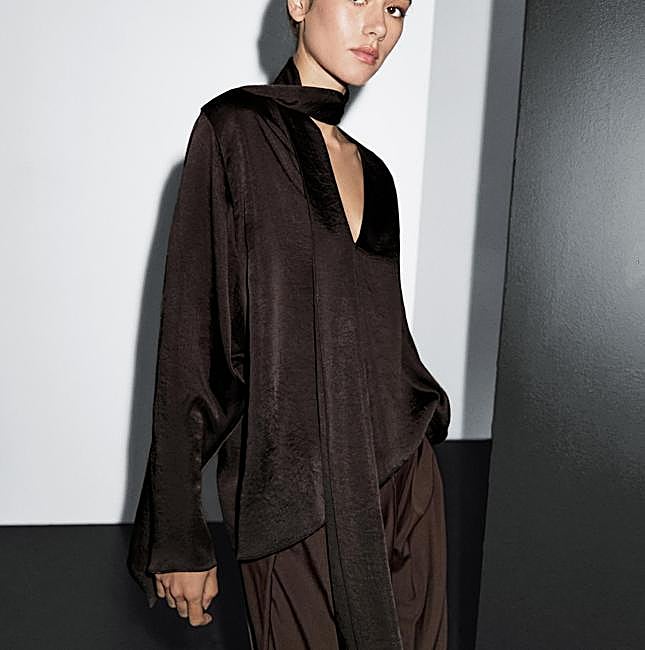 Blusa fluida de satén de Massimo Dutti con escote en pico, mangas largas y un cuello con detalle de lazo. Es de color marrón chocolate súper favorecedor. Precio: 59,95 euros.