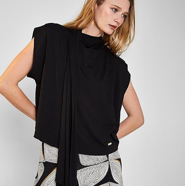 Blusa de Trucco de color negro con un cuello tipo pañuelo, manga corta sin costuras y un favorecedor escote drapeado.