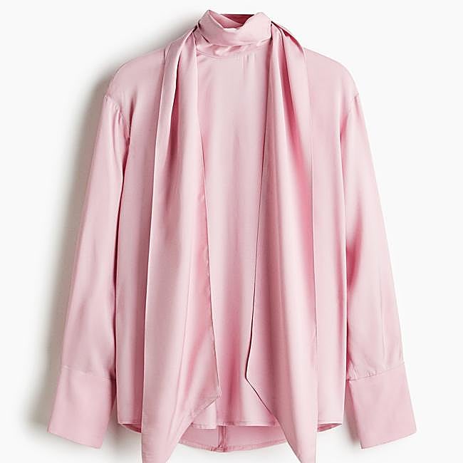 Blusa de H&M con cuello alto y pañuelo fijo que se puede llevar alrededor del cuello o sobre el hombro de forma informal. Tiene mangas largas con puños altos abotonados y rl bajo ligeramente redondeado en la espalda. Precio: 27,99 euros.