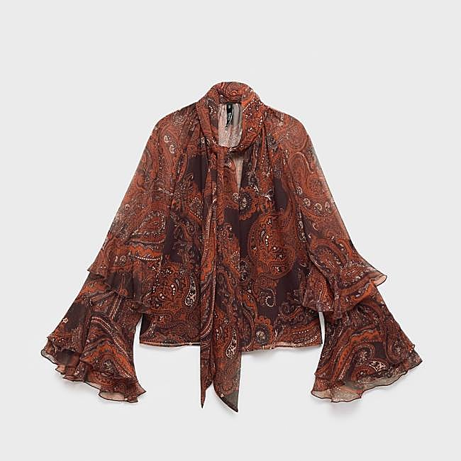 Blusa de Mango con manga larga. Su estructura plana y ligera se combina con una silueta slim que realza la figura. Destaca por su estampado paisley de estilo setentero y su diseño con volantes. Precio: 39,99 euros.