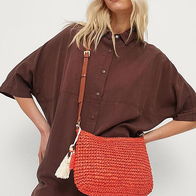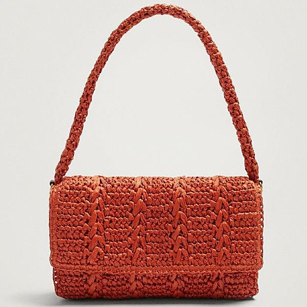 Se trata de un bolso de hombro en color naranja de Parfois. Es un bolso de fibra natural que cuenta con dos asas, una de rafia, y otra de cuero para que puedas llevarlo a modo de bandolera. Tiene un precio de 22,99 euros y se puede conseguir también en El Corte Inglés.