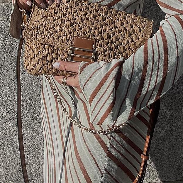 Algunas influencers no se han podido resistir ya a llevar este bolso de Parfois (25,99 euros) trenzado en sus looks. En este caso, se ha optado por un look más primaveral con un conjunto de punto compuesto por falda y top a juego con estampado de rayas. También puedes llevar este bolso de Parfois con una propuesta más todoterreno, como un traje o unos clásicos vaqueros con una camisa de volantes bonita y barata.