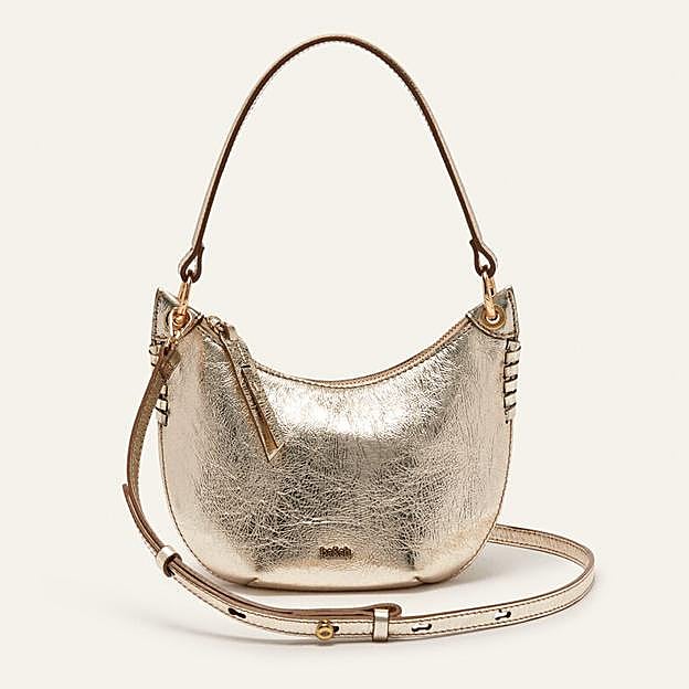 La versión metálica del bolso Swing de ba&sh retoma el ADN del icónico modelo y puede ser llevado cruzado, al hombro o en la mano gracias a su bandolera ajustable y extraíble. Cuesta 275 euros.
