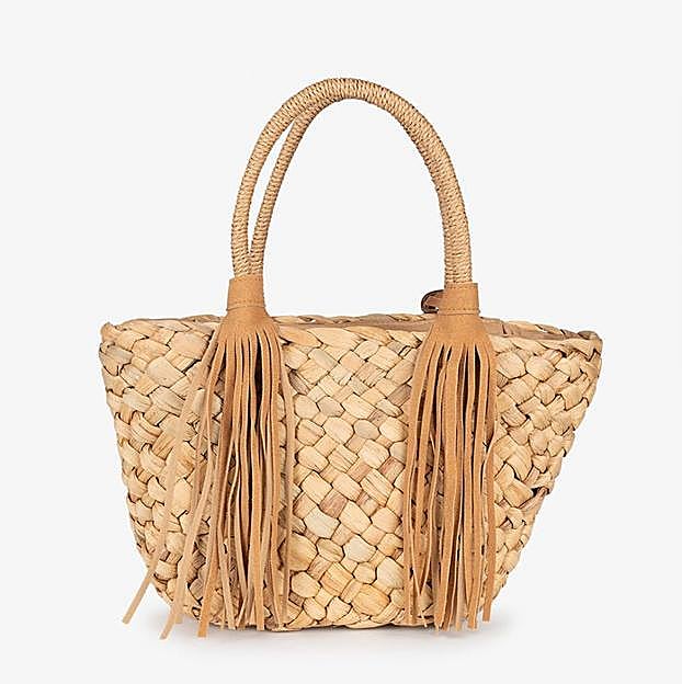 El bolso Evelin es la combinación perfecta de estilo bohemio y elegancia natural. Confeccionado en rafia trenzada, su diseño artesanal destaca por los detalles en piel con flecos, aportando un toque desenfadado. Sus asas resistentes lo hacen cómodo de llevar. Precio: 55,95 euros.
