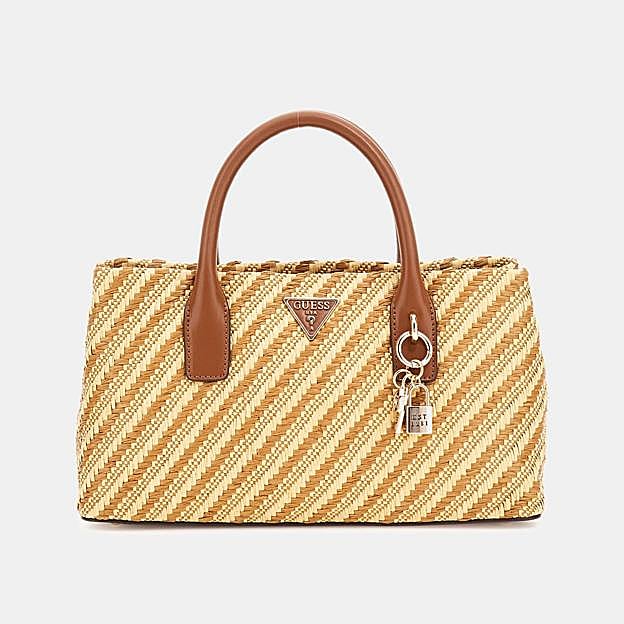 La fascinación atemporal de los bolsos de paja reina en la gama Simona y en este bolso tote Vikky II, de aspecto vintage y contorneado, con detalles de rayas diagonales. Precio: 145 euros.