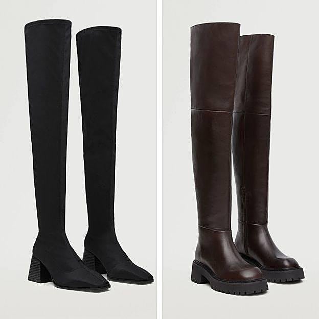 Mango dispone de dos modelos más para el día a día, pero igual de sofisticados y estilizadores. El primero es una bota de tejido elástico tipo calcetín por encima de la rodilla, que se ajusta a la pierna y da la sensación de mayor longitud, con tacón ancho muy confortable y apto para diario, en negro, por 59,99 euros (aunque también se pueden encontrar en celeste y marrón).