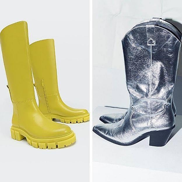 En Stradivarius damos con dos tipos de calzado muy diferentes y a la moda, que marcan la diferencia por sus colores. El primero, salido directamente de la pasarela al ser un clon de los modelos de Isabel Marant o Fendi, unas botas estilo cowboy de media caña, con tacón ancho de 7 cm y acabado metalizado en plata, disponibles por 59,99 euros, aunque se agotaron al momento así que si las quieres conseguir y llevarte todos los 'likes' de Instagram, debes apuntarte a la lista de espera.