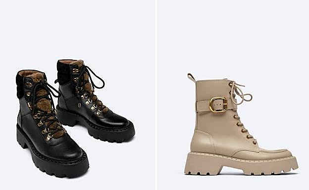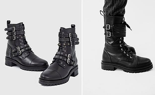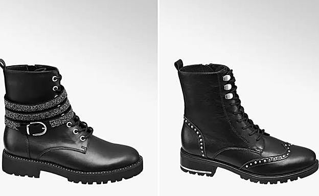 En Deichmann encontramos dos botines militares esenciales con un toque diferente que los hace especiales y atractivos. Puedes elegir entre un diseño de suela gruesa dentada, en negro, con detalle de tiras en espiral con glitter, sujetas por una hebilla plateada, a 49,99 euros, ideales para salir de noche. O, un botín con costuras marcadas adornadas por tachuelas metálicas, pasadores del mismo material en la parte superior de los cordones y una línea plata en la suela, por un precio de 34,99 euros.