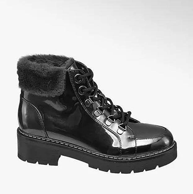 La primera propuesta viene de parte de Deichmann, mezcla de estética militar con montaña. Son unos botines de acabado lustroso en negro, con suela track y forro de pelo en el mismo tono, geniales para llevar con leggings, jersey oversize y abrigo con cinturón, por un precio rebajado de solo 31,99 euros.