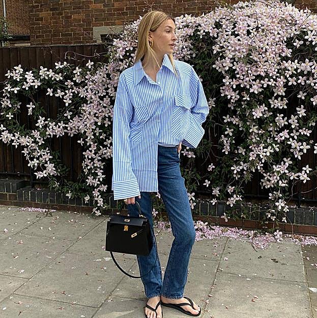 La francesa Camille Charriere se decantan por los básicos. Combina una camisa a rayas color azul XXL con una parte metida por dentro de unos vaqueros rectos en azul medio. Los complementos son los encargados de crear contraste entre la informalidad de unas sandalias destalonadas o chanclas negras planas y un bolso estilo city bag color negro, de aspecto lujoso. Agrega unos pendientes de aro finos en dorado y listo. Aunque, si a ti no te va eso de llevar chanclas, puedes cambiarlas por unas bailarinas en crudo o rojo.