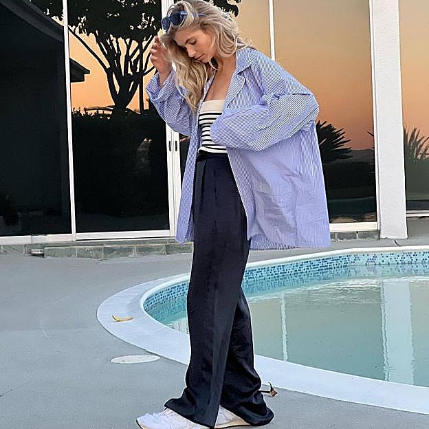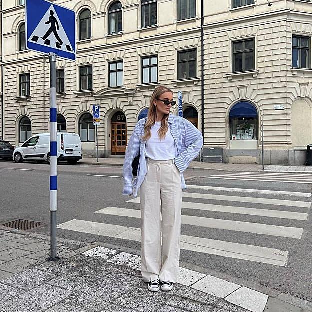 El primer look lo propone la influencer Fredrica Eriksson. Ella apuesta por la comodidad conjuntando una camisa oversize a rayas azul con una camiseta básica de tirantes o mancha corta en color blanco. Para la parte de abajo, elige un pantalón de traje ancho con talle alto en crudo o beige claro y mete la camiseta por dentro de este. Como accesorios, añade unas zapatillas tipo Converse en negro y un bolso acolchado de hombro, también en negro, aunque con un shopper en color marrón también queda ideal.
