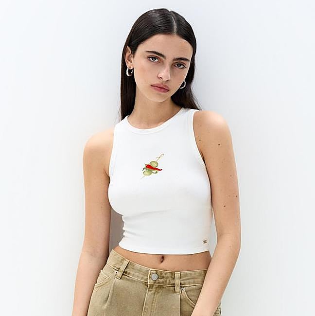 Pull&Bear. La firma de Inditex tiene este tank top, es decir, una camiseta ajustada, cropped y sin mangas con una gilda en el pecho (9,99 euros).