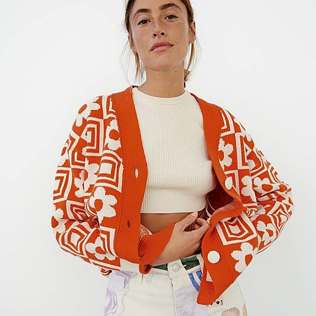 El siguiente modelo combina los dos estampados del momento y uno de los colores de la temporada. Se trata de un cárdigan de estilo retro con print combinado geométrico y floral, en naranja. Muy cómodo por su amplia silueta, con escote de pico, acabados a contraste y botones grandes forrados a tono. Su precio es también de 29,95 euros y viene en la S, M y L.