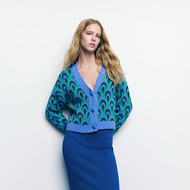 Muy original y favorecedor es este diseño que recuerda a la belleza y elegancia de los pavos reales. Una chaqueta de punto con estampado jacquard geométrico en tonos verdes y azules, con escote de pico, acabados en rib combinados y cierre de botones. La puedes encontrar a 25,95 euros y de las tallas S a la M.