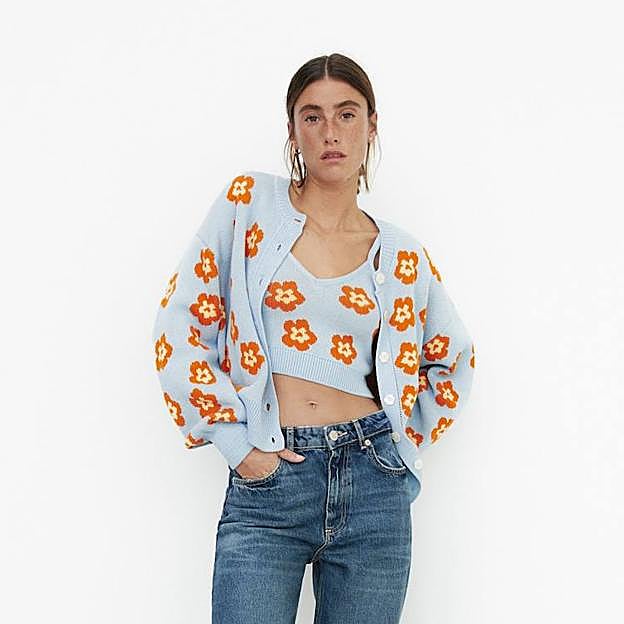 Las flores nos evocan a la primavera y por eso no hay mejor oportunidad que lucirlas. Así que tienes que apostar por esta chaqueta de punto oversize en tejido jacquard con maxi estampado floral azul claro y naranja. Tiene cuello redondo, silueta relajada con costura de hombros caída, manga ligeramente abombada y botones joya en forma de flor. Está disponible por 29,95 euros en las tallas S, M y L.