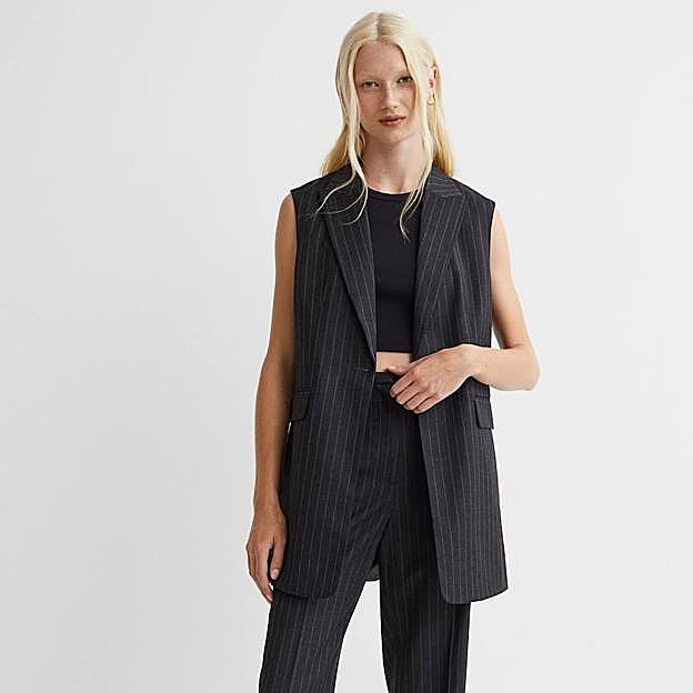 H&M también apuesta por la formalidad y elegancia de los trajes clásicos en este chaleco largo y recto con solapa de pico, abertura posterior, bolsillos delanteros ribeteados, cierre de botón y estampado de raya diplomática, en color gris oscuro. Tiene un precio de 29,99 euros y está disponible de la XS a la XXL. Con una camisa oversize de rayas azul y falda midi sienta de maravilla, aunque también lo puedes llevar con su pantalón a conjunto.