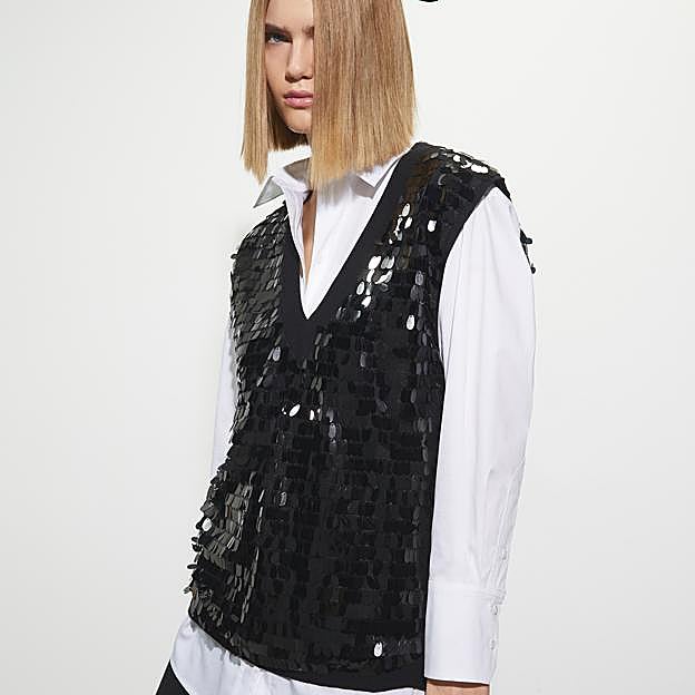 Este chaleco de lentejuelas parece de una marca de lujo pero no lo es. Para nuestra suerte, solo cuesta 29,99 euros. ¿La mala noticia? Que está agotado en sus dos tallas aunque con lista de espera, por lo que no tardará en volver.