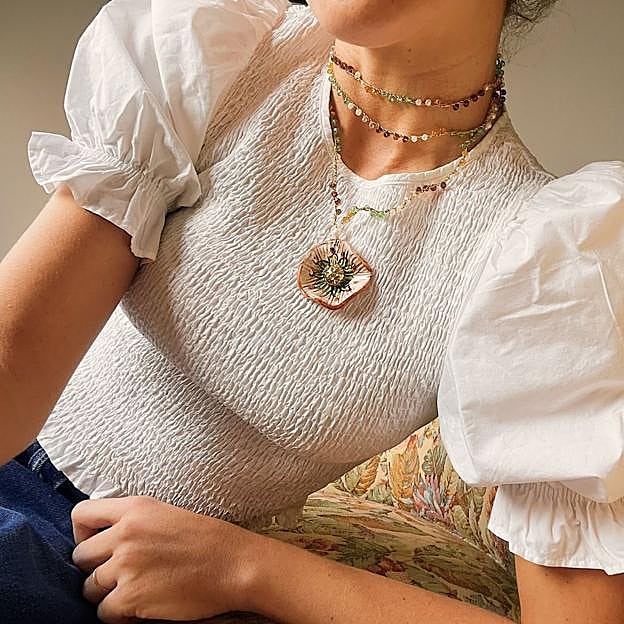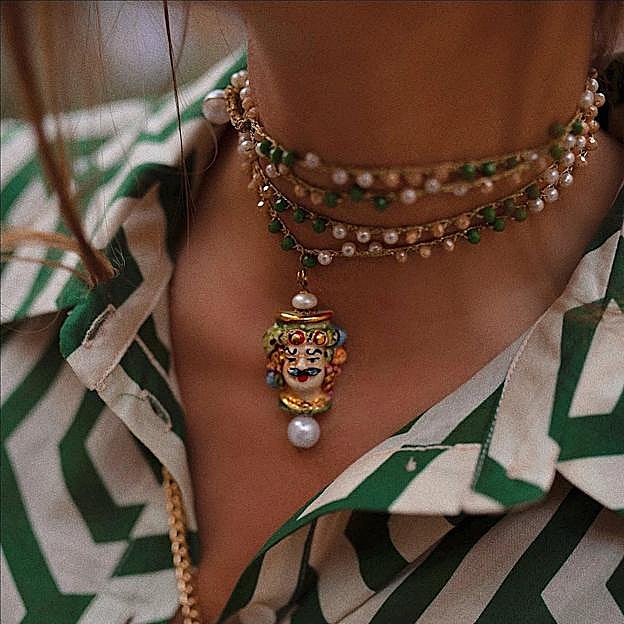 Aunque collares hay miles, no hay duda que estos de Cashfana son una maravilla. No son excesivamente caros, y además, están elaborados a mano. Uno de los collares que causa furor en las redes es este con cadena tejida a mano, piedras de circonita y perlas naturales. Destaca una figura hecha a mano de cerámica siciliana. Se trata de una pieza bajo pedido previo y elaborado en italia. Cuesta 55 euros y la cadena mide unos 70 cm de largo.