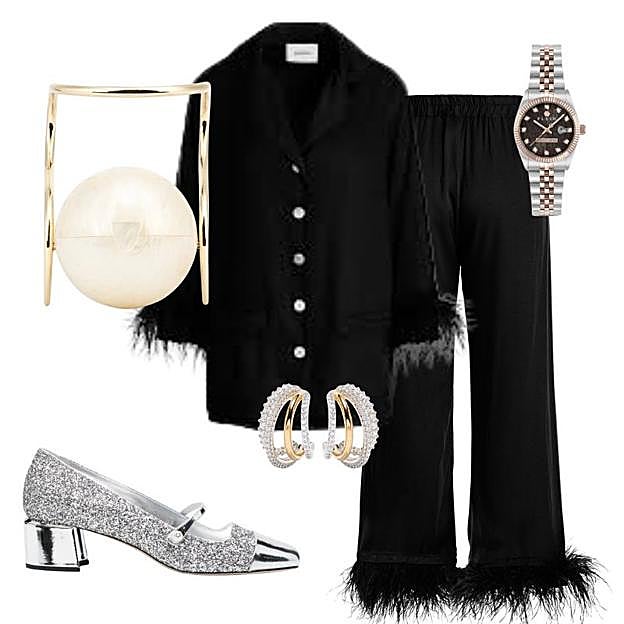 ¿Que buscas algo más premium? No hay problema. Vamos a darle un giro más elegante con este pijama de Sleeper (273 euros) y estas merceditas de Jimmy Choo (420 euros). Un par de accesorios especiales marcarán la diferencia, como este bolso de Cult Gaia (713 euros), estos pendientes de Swarovski (179 euros) y este reloj de Phillipp Plein (450 euros).