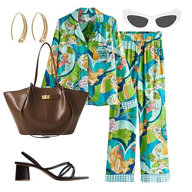 ¿Que buscas todo lo contrario? También es posible. Solo necesitarás un pijama un poco menos llamativo como este de Never Fully Dressed (81 euros) y unas sandalias discretas: H&M (22,99 euros); un bolso a juego: Gina Tricot (49,95 euros), unos pendientes especiales: Ralph Lauren (34,95 euros) y unas gafas de sol para completar tu look de día: Dolce&Gabbana (183,50 euros).