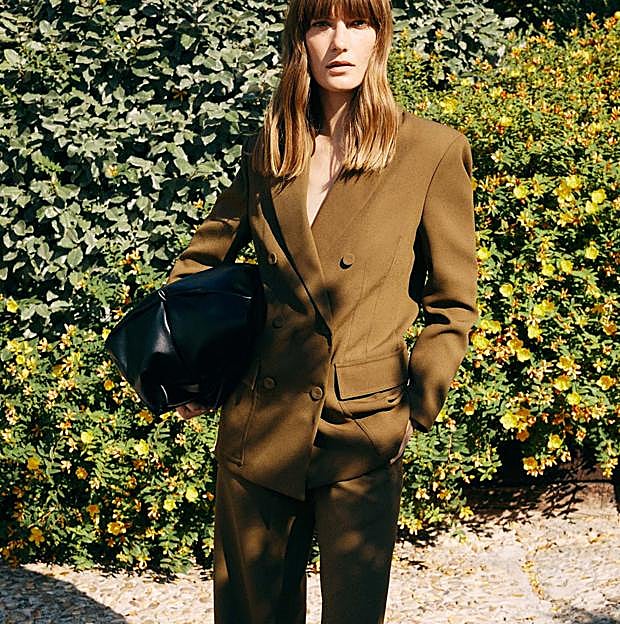 De patronaje ancho y declinado en tonos marrones, este conjunto tiene la sobriedad necesaria para contrastar con el corte de la americana de doble botonadura y la contundencia de las hombreras, que le dan presencia y un sutil guiño a la estética ochentera. Con solapa ancha y bolsillo laterales, cuesta 59,99 euros y está disponible de la S a la L.